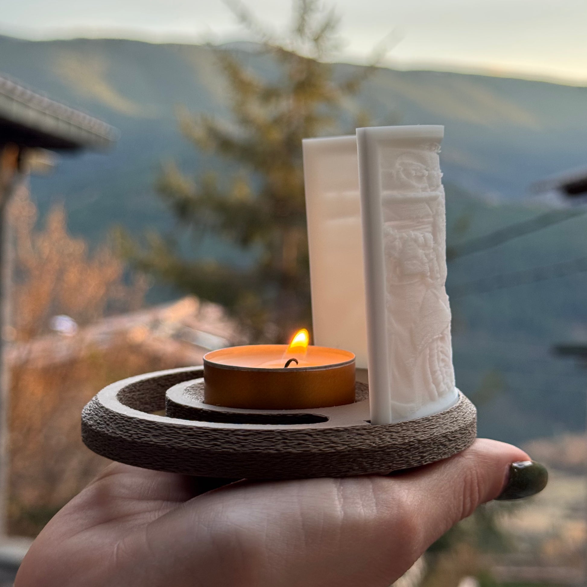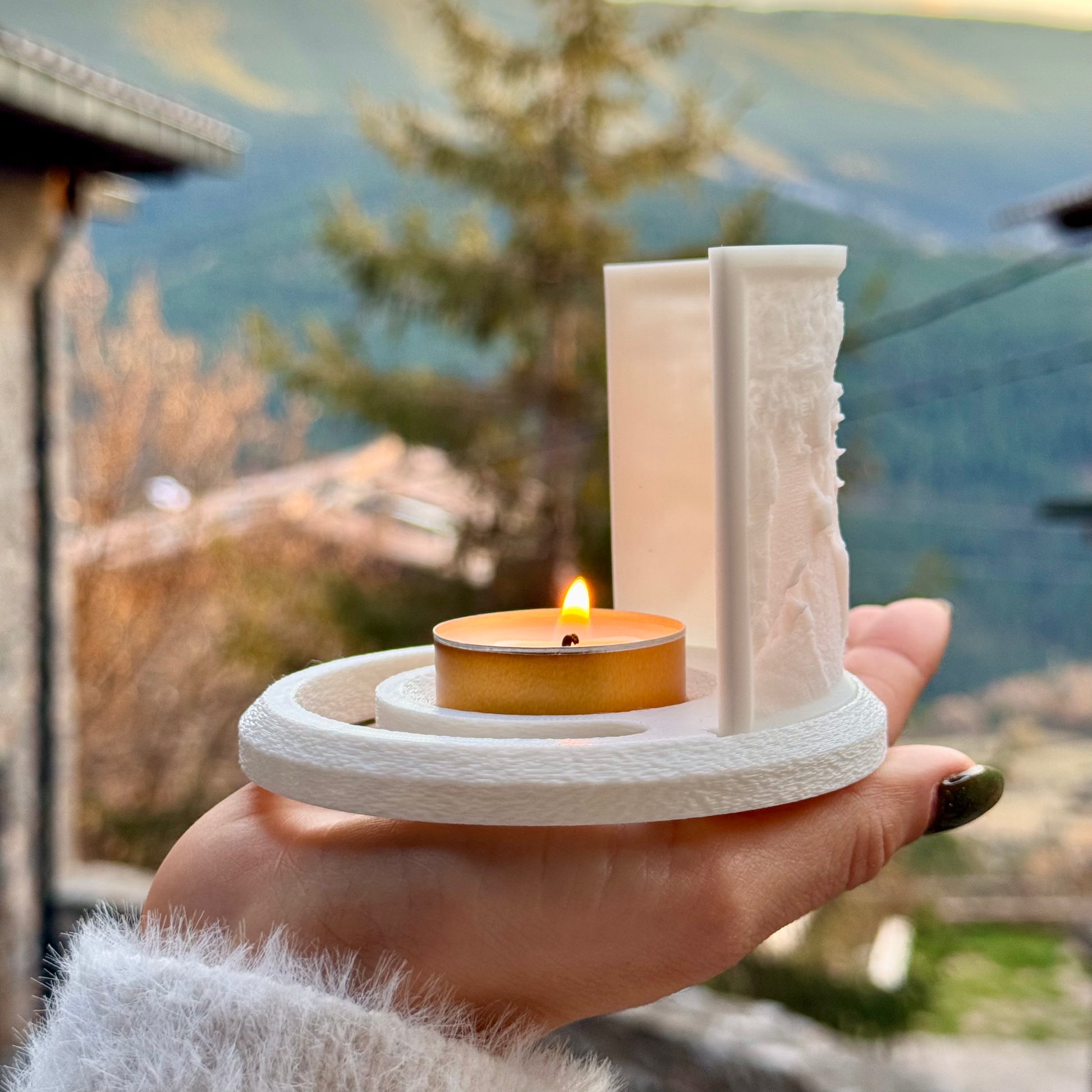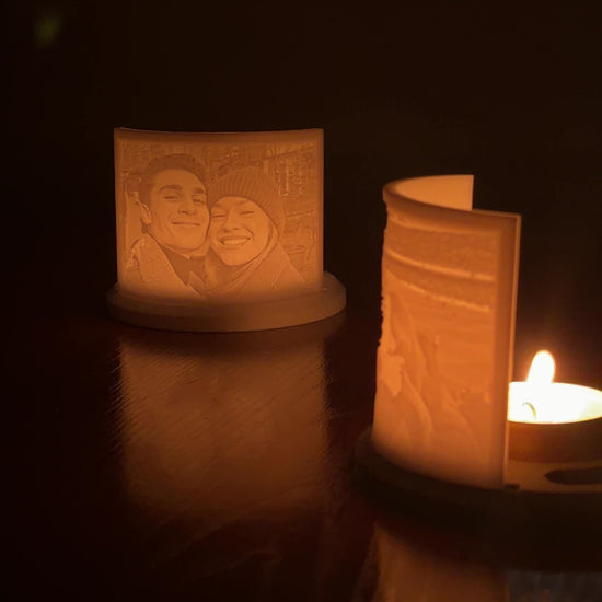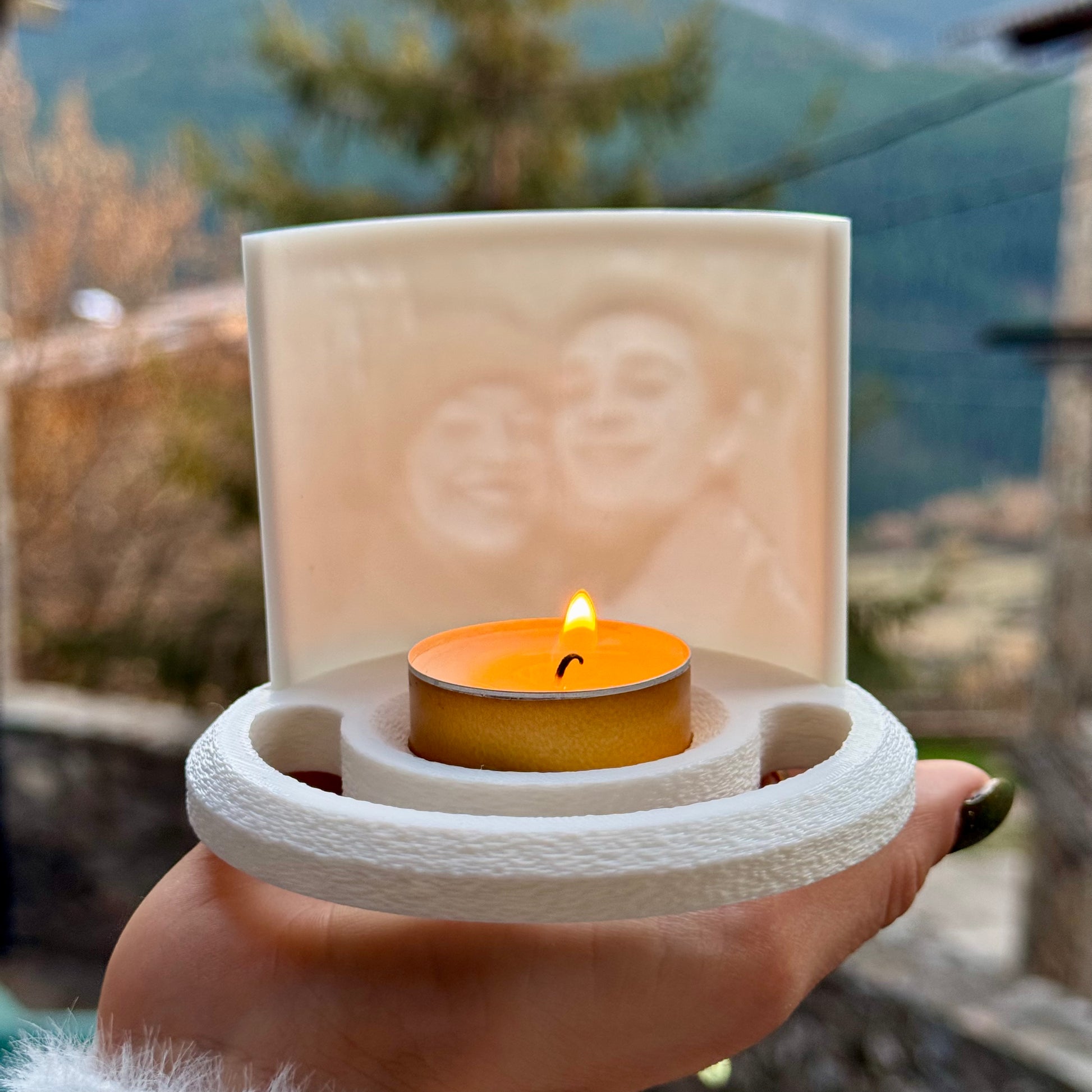 Cada pieza está creada con impresión 3D, y personalizada con la imagen que tú elijas. Simplemente enciende la vela y contempla como el fuego la ilumina.
